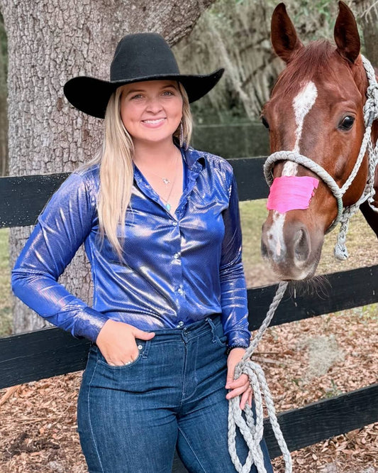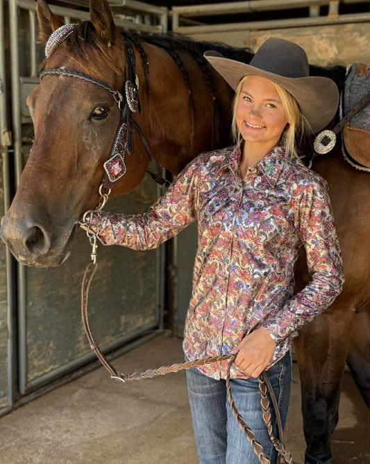 Witness the captivating scenes of the "Ranch Girls" with their horses elegantly adorned in our rodeo shirts, showcasing a perfect blend of style and functionality that enhances their performance in the rodeo arena. Each image captures the essence of our premium shirts, tailored for both comfort and durability, ensuring these riders are not only stylish but also fully equipped for success in the rodeo sport.