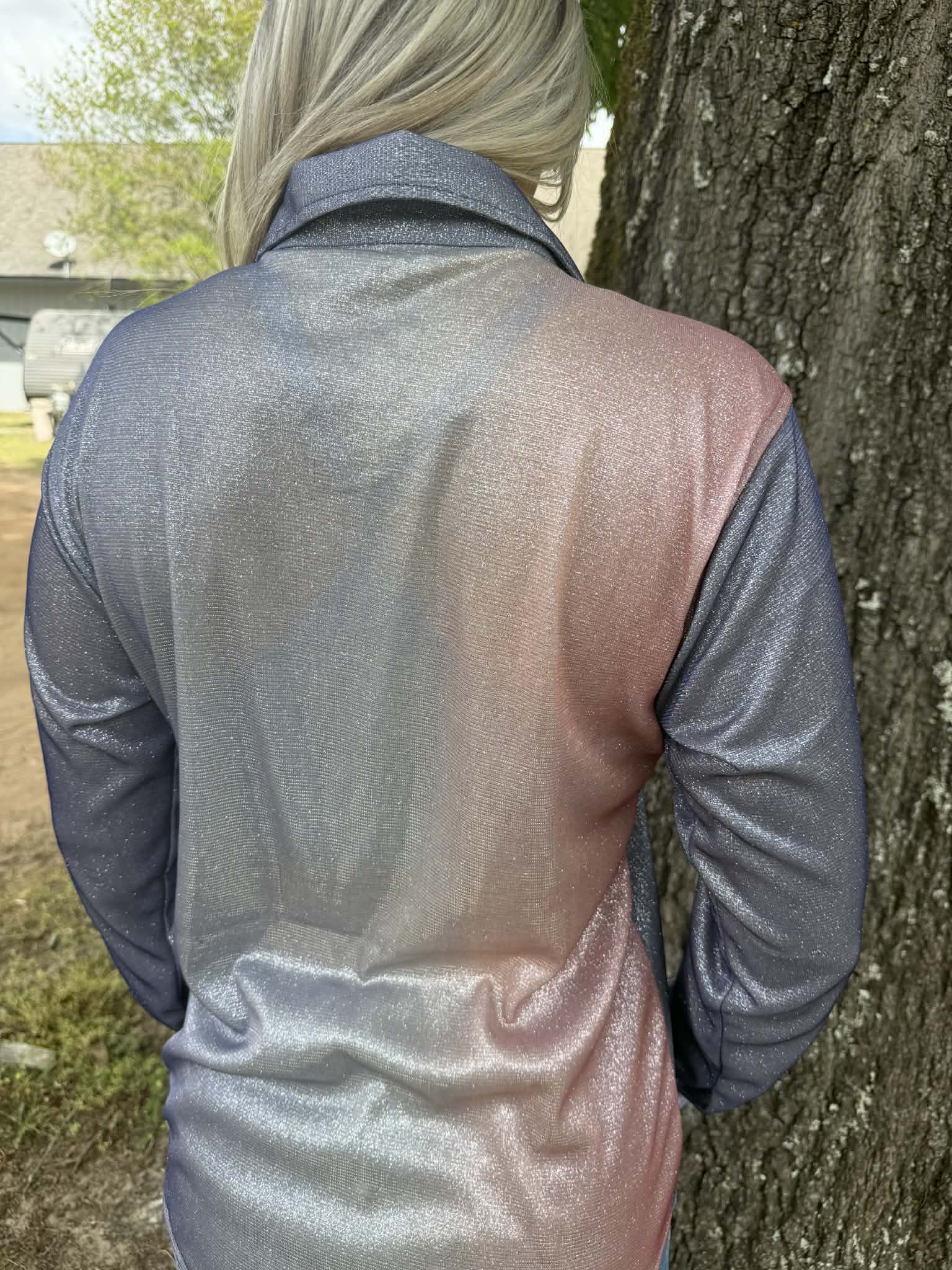 The Silver Dust Ombre Performance Show Shirt blends a soft shimmer with a subtle gradient of steel gray into warm rose tones, creating a finish that shifts with every movement. Under arena lights or out in the sun, it gives you that quiet, confident glow that stands out without trying too hard.