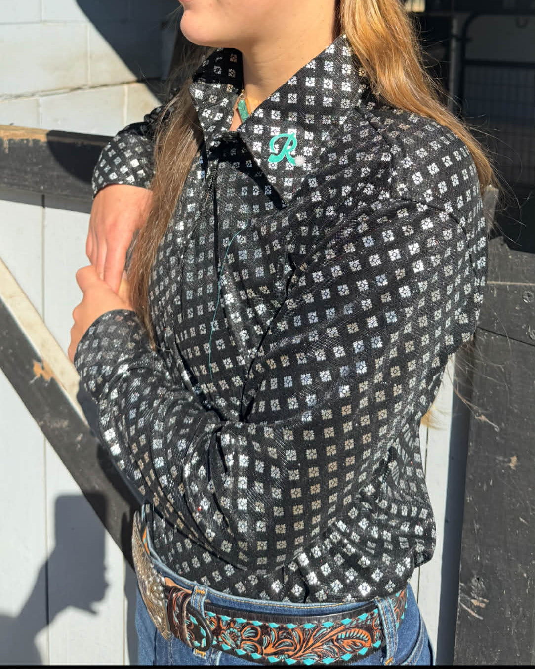 The Midnight R Diamond Show Shirt is designed for riders who want a refined, confident look in the arena without sacrificing comfort. Featuring a sleek black base with a subtle white diamond pattern, this shirt delivers classic western style with a modern edge. The heat-pressed teal R logo on the collar adds a signature Ranch detail that stands out under the lights.
