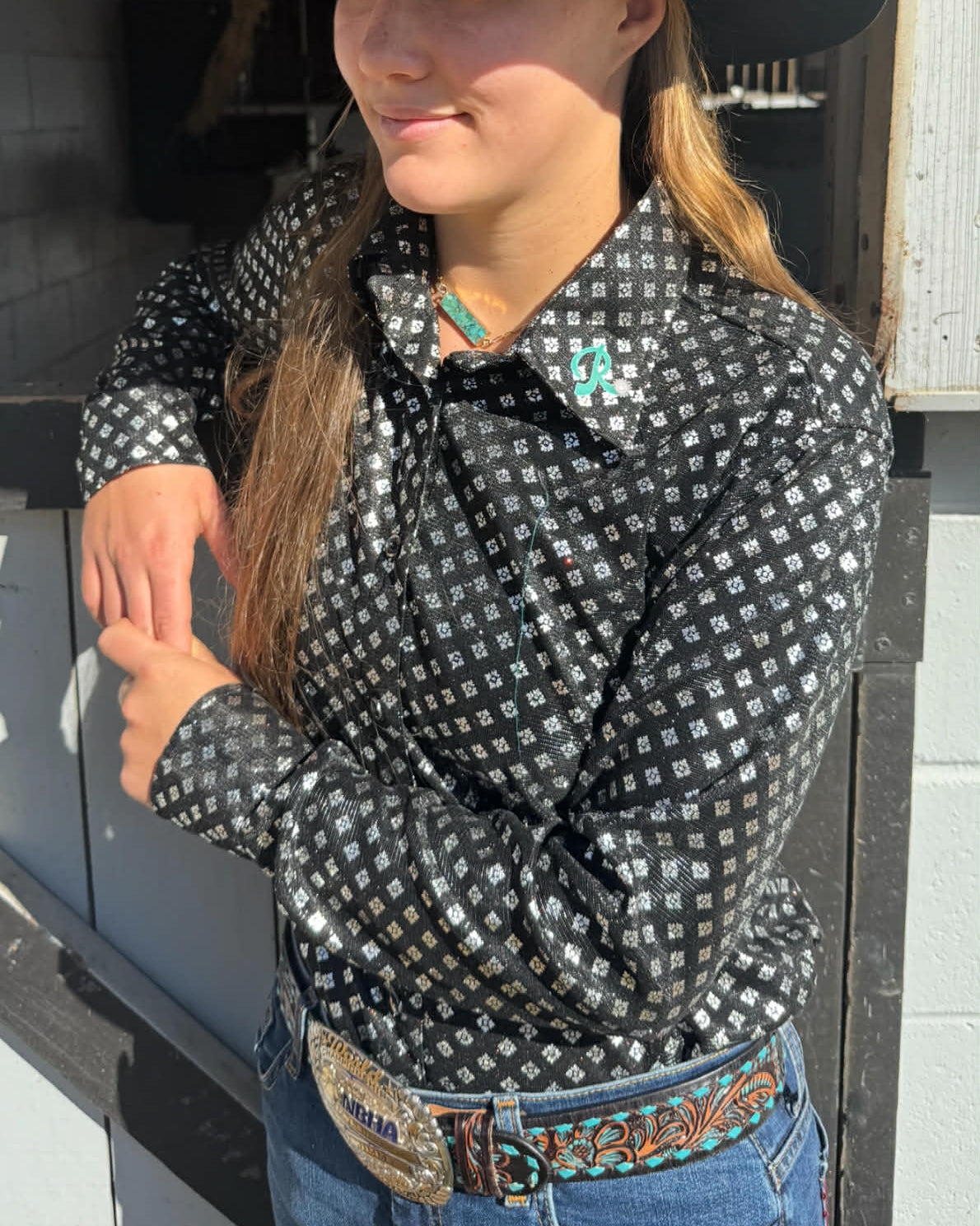 Crafted with a smooth, performance-driven fabric, this long-sleeve show shirt offers a flattering, tailored fit with just the right amount of stretch for ease of movement. Lightweight and breathable, it’s made to keep you comfortable from warm-up to victory lap. Whether you’re competing in the barrel pen or stepping into the show ring, The Midnight R Diamond Show Shirt delivers polished style you can ride in with confidence.