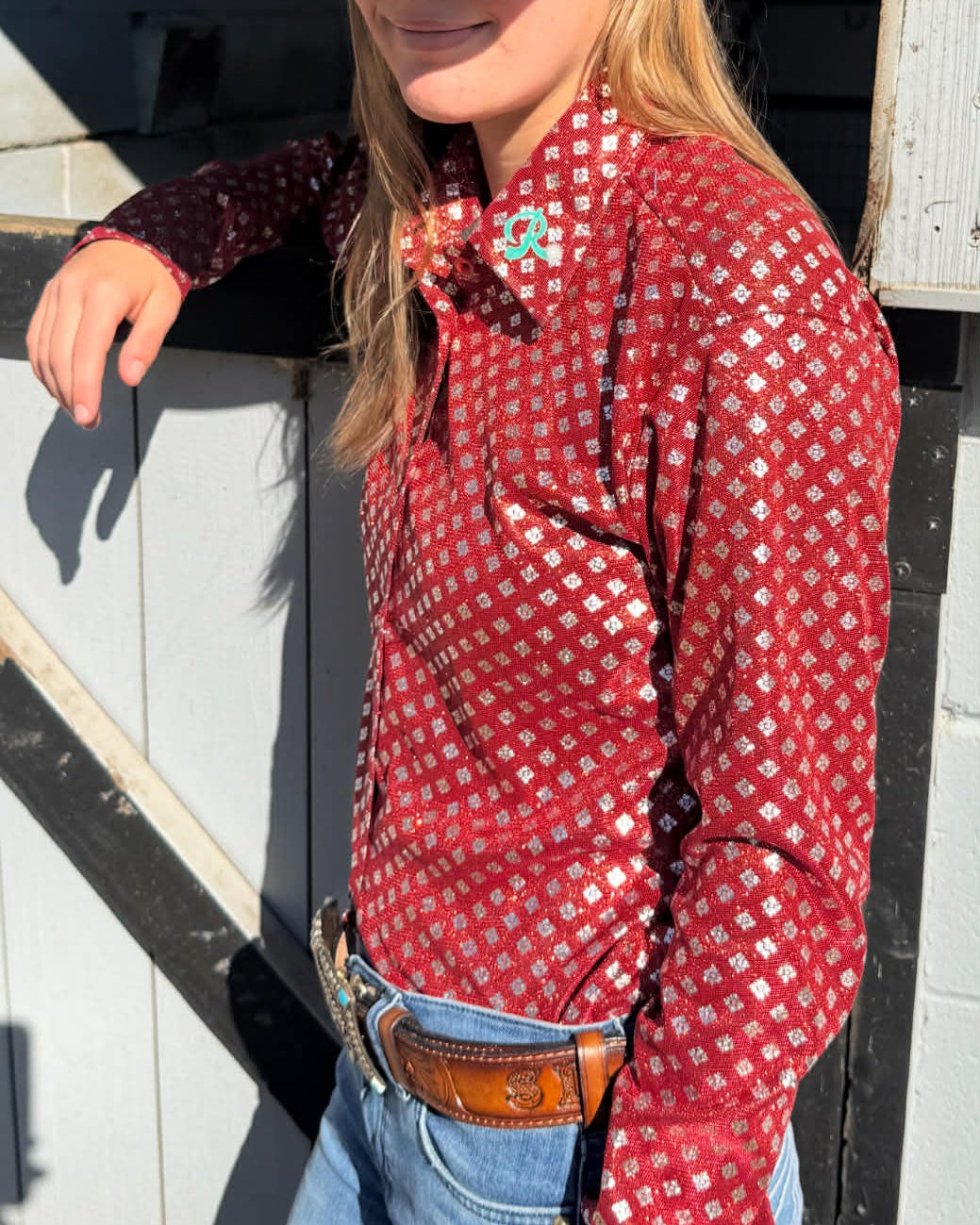 Turn heads in the arena with the Red Rock Royale Show Shirt, a bold statement piece crafted for riders who want the spotlight the moment they walk through the gate. This stunning top features a rich red base layered with a metallic silver geometric shimmer that catches every ounce of arena light. Designed with our signature Ranch fit, it offers structured stretch, all-day comfort, and that unmistakable western-glam shine.
