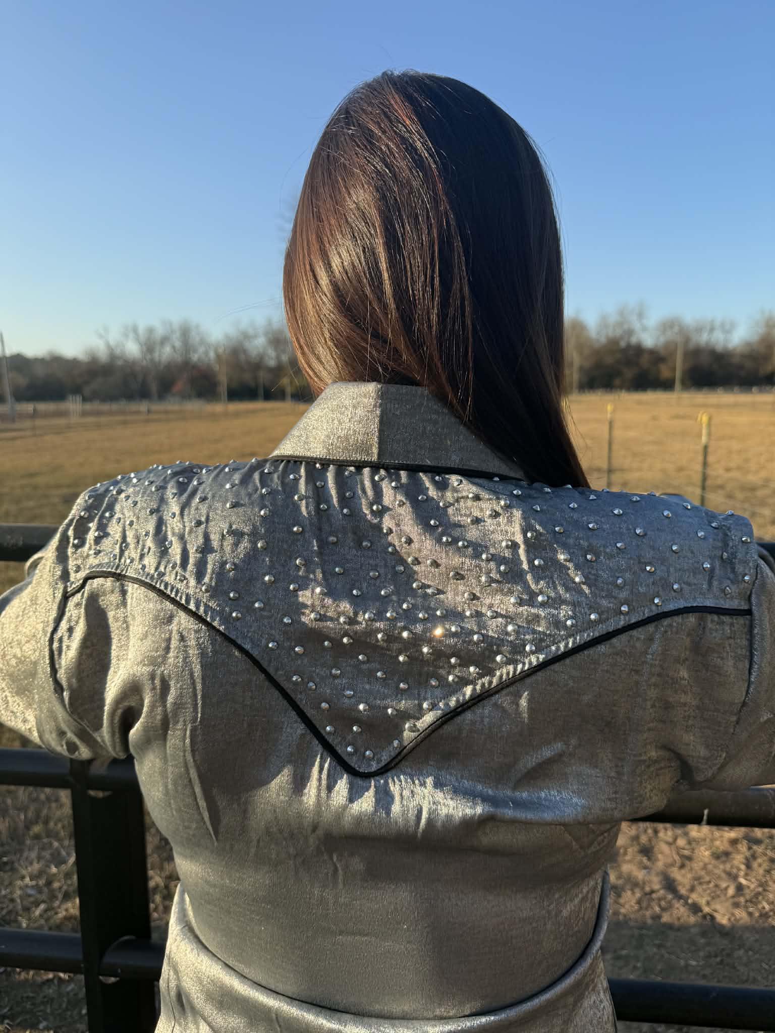 Meet the Silver Star Studded Show Shirt — the perfect blend of performance, shimmer, and western elegance. Designed for the cowgirl who loves a bold arena moment, this shirt features a high-shine metallic finish that catches every ray of sunlight and every arena light.